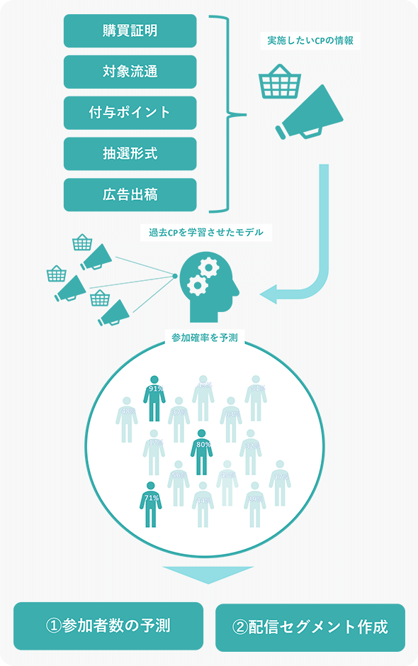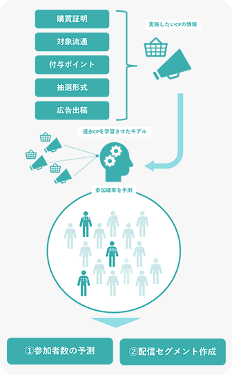 予定している販促施策の情報(ポイント数、CP期間、対象流通、平均購入個数など)を入力すると、「参加者数(=CP効果)」が自動的に算出されます。これにより、CP条件によるCP効果の大小が判明し、確実性の高いプランニングを実施することができます。