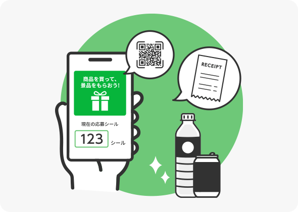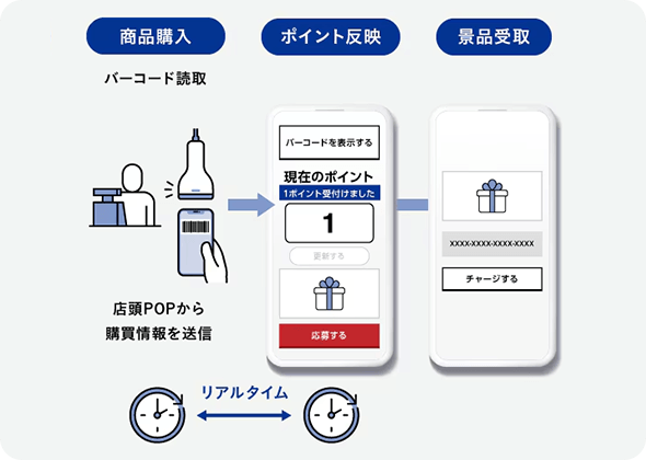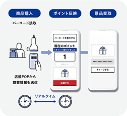 お客さまは専用バーコードをレジで読み取ってもらうことで、リアルタイムに購買を証明でき、即時にインセンティブを受け取ることができます。CP内容も自由に設計することが出来るため、複雑な条件(まとめ買い、セット割り)のCPにも対応可能です。